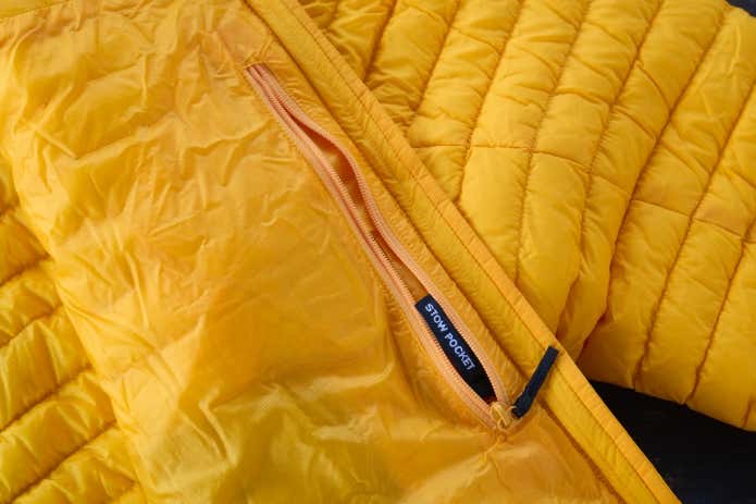 サンダージャケットと同様に、こちらも内側のチェストポケットに収納できるパッカブル仕様。パッキング時に荷室のスペースを取りません。付属する小ぶりなスタッフサックに入れて持ち運ぶことも可能です。