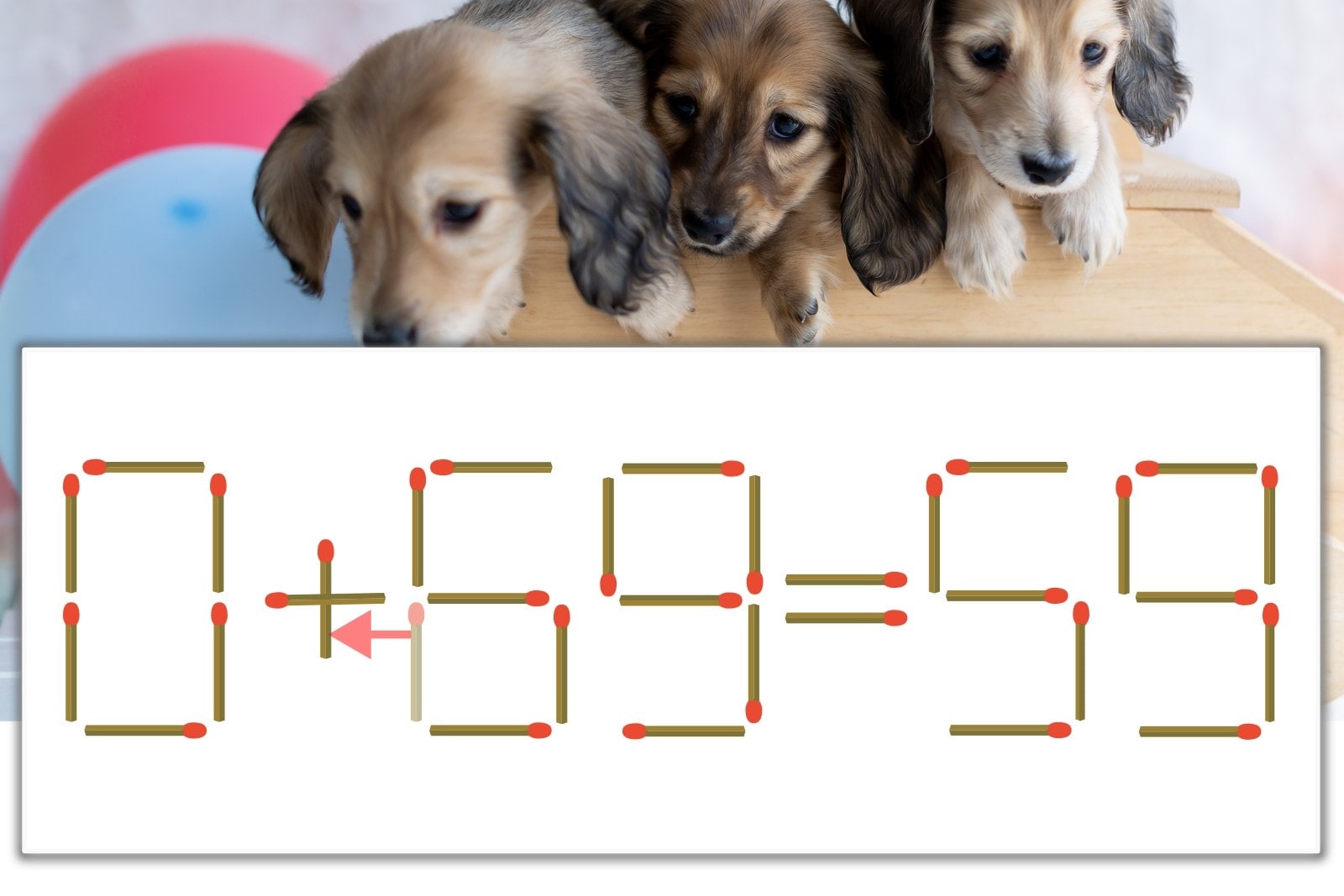 「6」を別の数字に変化させると答えが導き出せます。「6」のマッチ棒を1本移動して、「-」を「+」にしてみましょう。すると、「0+59=59」が成立します。