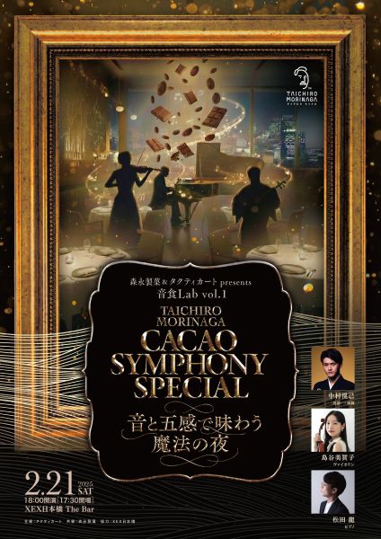 演奏を聴きながら食事を楽しむ。でもディナーショーではない。「音楽が味覚に与える変化」を科学的に、そして感性で体感しようという新しいダイニングコンサート、「森永製菓&タクティカート presents 音食Lab vol1 TAICHIRO MORINAGA カカオ シンフォニー スペシャル」が、2026年2月21日(土)に東京のXEX日本橋で開催される。一夜限りのスペシャルメニューと生演奏のペアリングを楽しむ特別な体験ができる。17時30分開場、18時開演。主催はタクティカート(東京)。森永製菓が共催。
