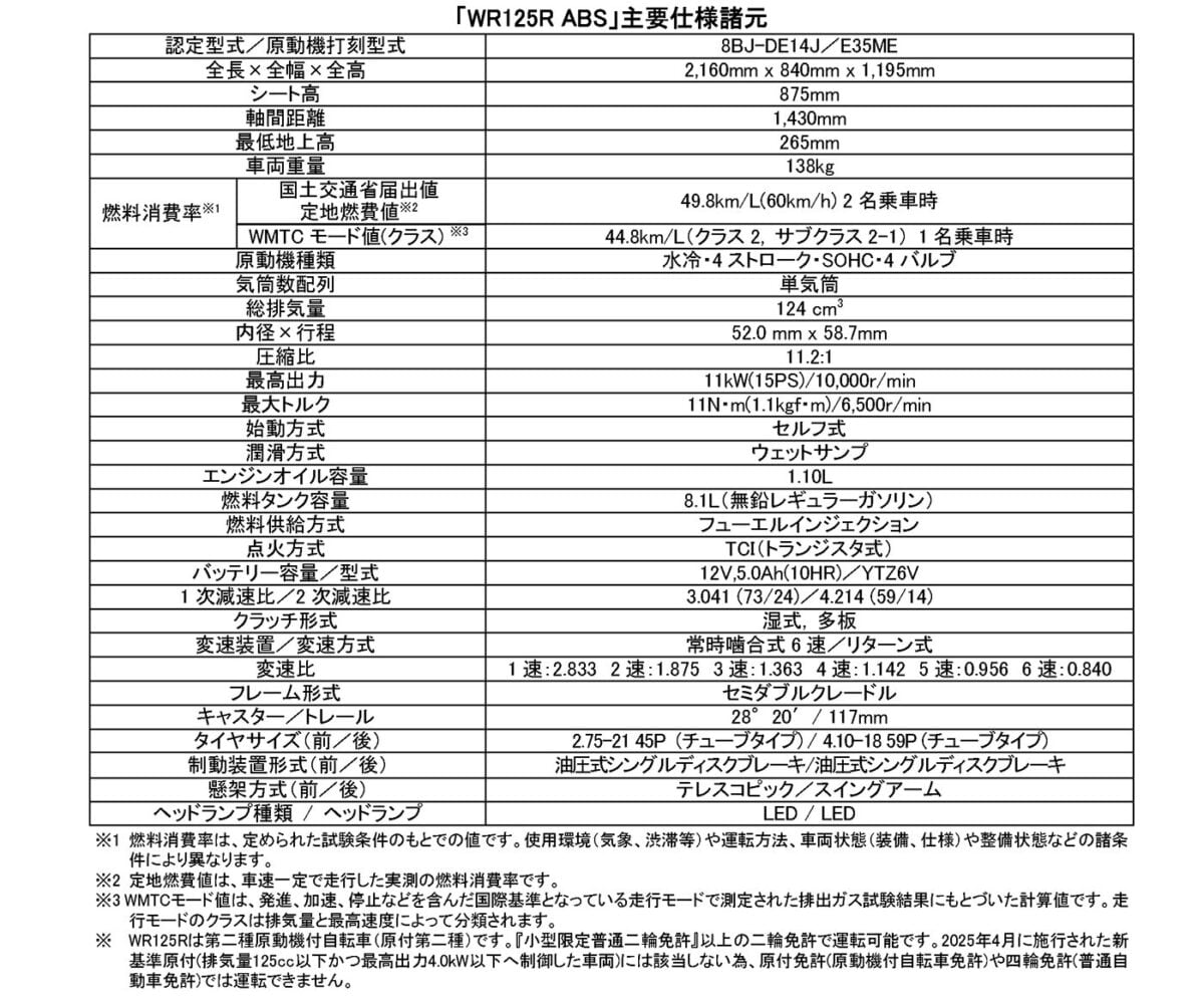 ヤマハ発動機販売株式会社は、オン・オフ両方に対応した新型モデル「WR125R ABS」を2026年1月30日に発売すると発表した。
