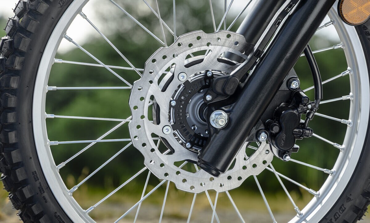 フロントブレーキはφ267mmディスクローターと2ポットキャリパー、リアはφ220mmディスクローターとシングルポットキャリパーを組み合わせています。いずれも、パッド材質など摩擦系と、レバー比などの入力系との相互バランスを整えており、オフロードからオンロードまでさまざまなシーンで、コントロール性に優れた制動力を発揮。なおフロントブレーキにはABSを装備しています。