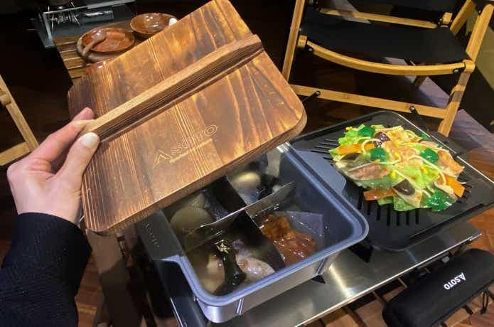 5つの調理器具のなかでも、抜群の存在感を発揮していたのが「カコム おでん鍋」。ロゴ入り木蓋が渋いですよね。一見すると色物ギアだけど、1台で超マルチに使えるクッカーなんです。