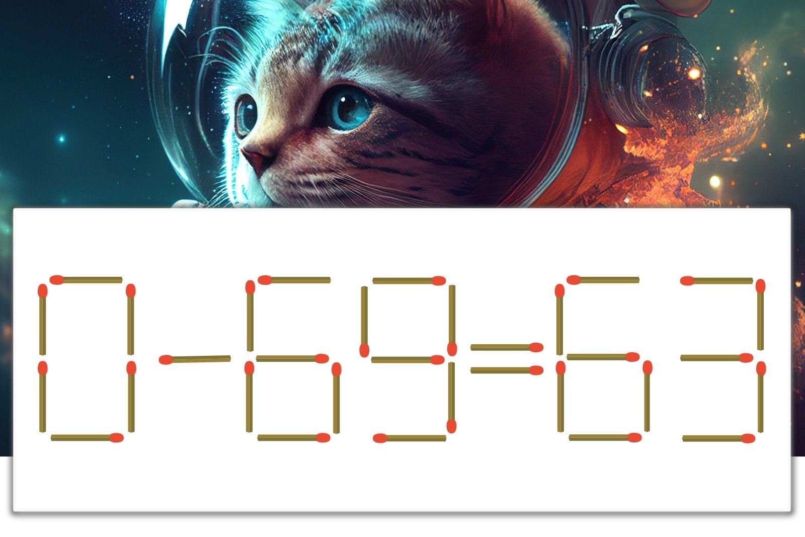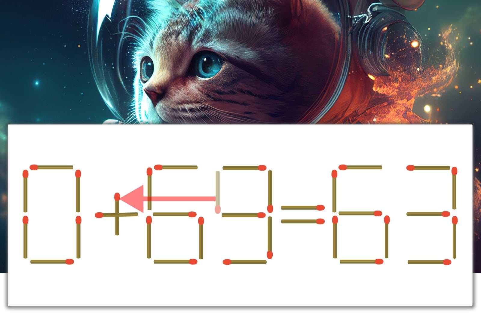 「9」を別の数字に変化させると答えが導き出せます。「9」のマッチ棒を1本移動して、「-」を「+」にしてみましょう。すると、「0+63=63」が成立します。