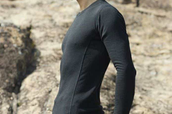 モンベル「ジオライン EXP.ラウンドネックシャツ Men’s」は、シリーズ内でも最も暖かい厚手モデル。表面の滑らかな層と、肌側の起毛した層を隔壁でつないだ“ボックス構造”によって、内部にデッドエア(動かない空気)をしっかり保持し、高い保温性を発揮します。