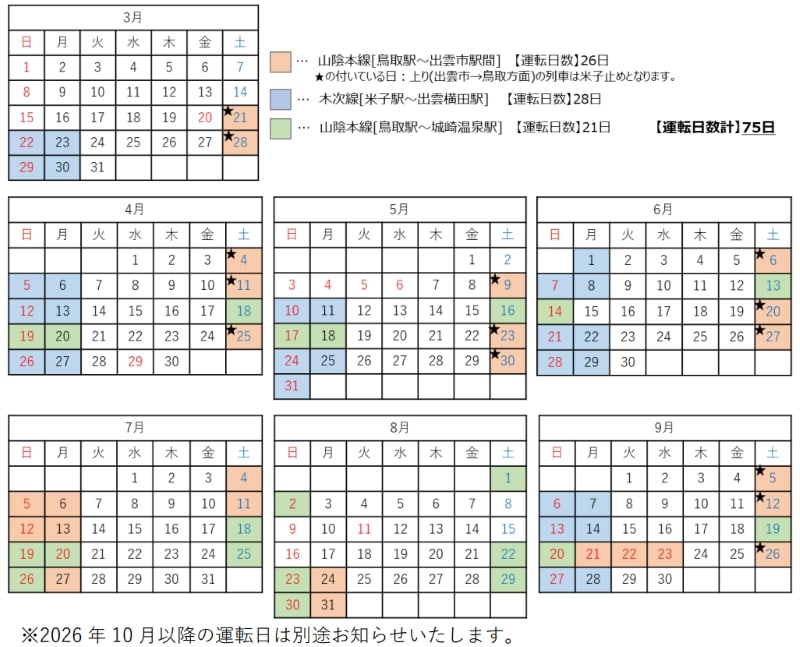 2026年3月~9月までの半年間、「あめつち」は週末を中心に各線区で1日1往復運転します。合計の運転日数は75日。3つのコースそれぞれの内訳は以下の通りです。