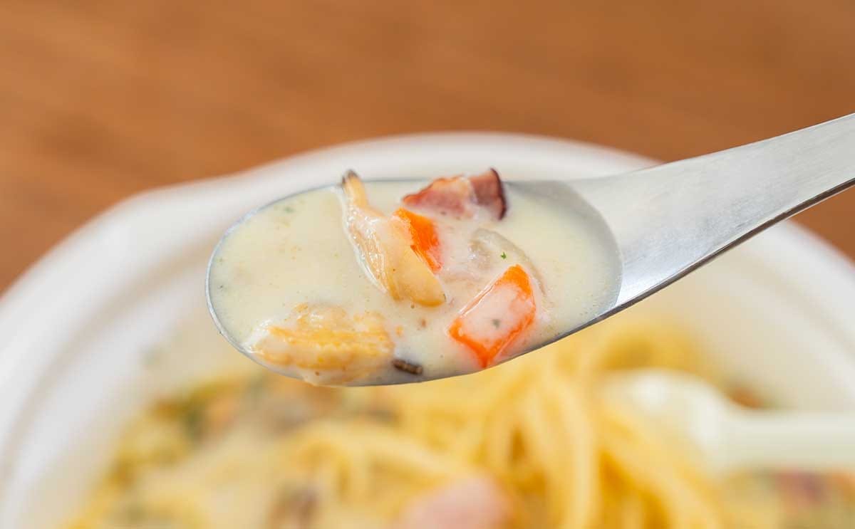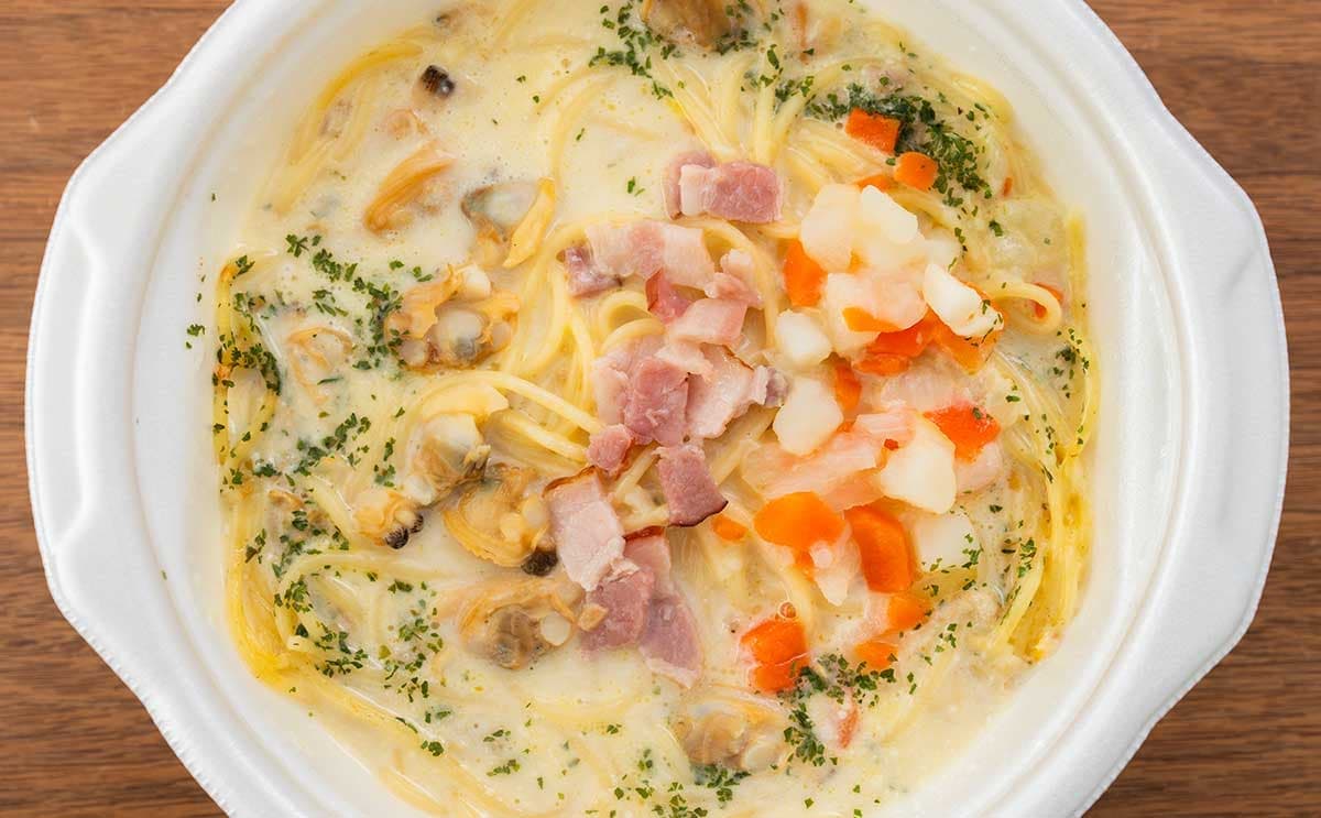 本商品は、あさりや野菜の旨みが溶け込んだクラムチャウダースープにパスタを合わせたものです。