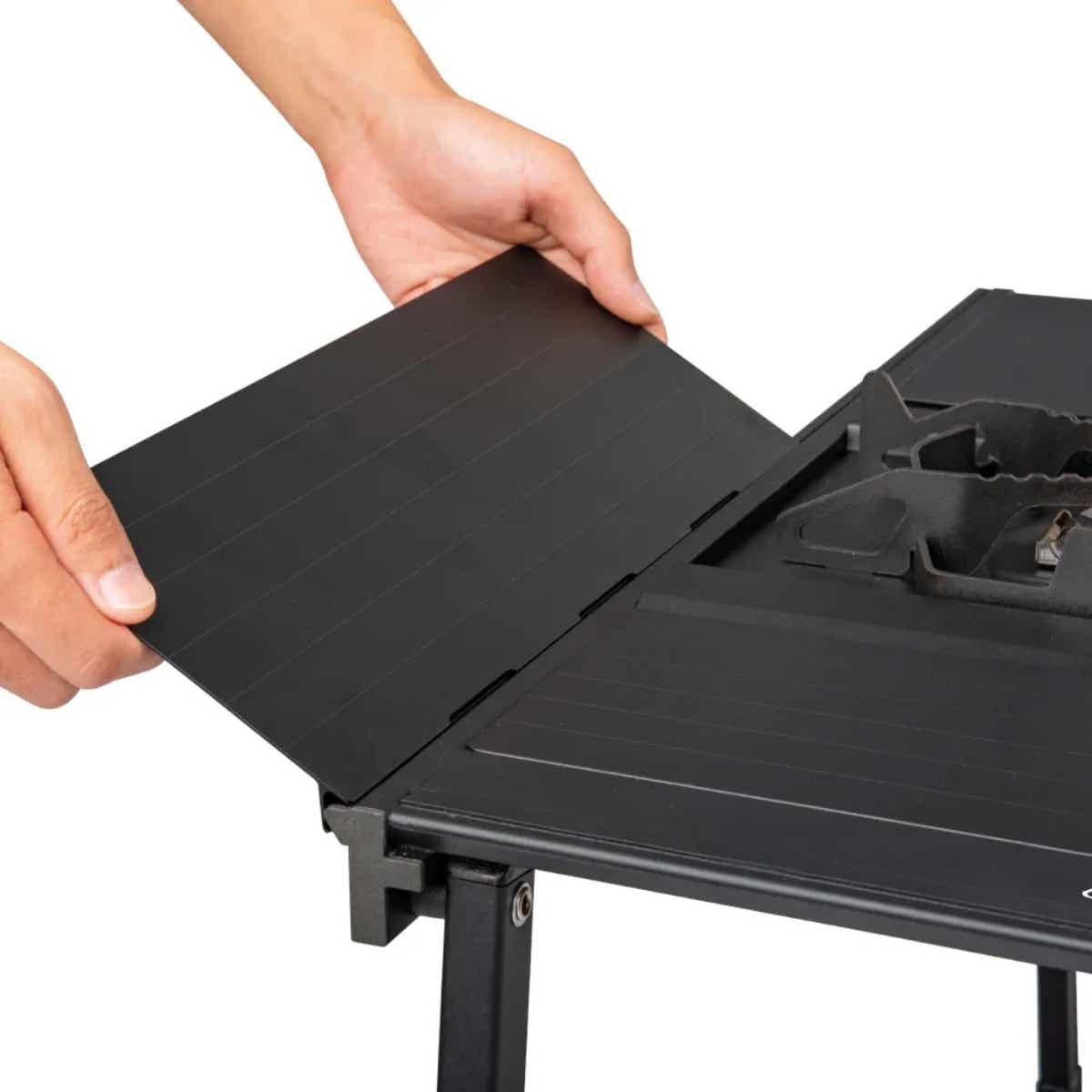 卓上バーナーをテーブルに組み込み、調理スペースとしてまとめて使うスタイルは、近年キャンプシーンで広がりを見せているカテゴリーのひとつ。