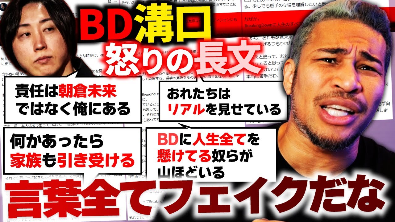また、深刻な事態が起きた後も、選手たちは“金稼ぎの場”を失わないことを最優先にしているように見えたとし、「今回一番気持ち悪いなと思ってるのは、このBD男優たちなんだよ」と批判。Breaking Downを「ゴミ箱」に喩えて、「ゴミ箱にゴミを入れてんだ」と話す場面もありました。