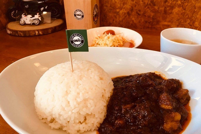 オーナーの愛車をはじめ、トライアンフやヤマハSR400などの展示車両も楽しめる。看板メニューはスパイスから仕込む特製カレー。チキン/ポークが選べるバリエーションが用意されている。ライダー同士が自然に交流できる雰囲気が魅力で、ツーリング途中の休憩や仲間との集まりに最適な場所となっている。
