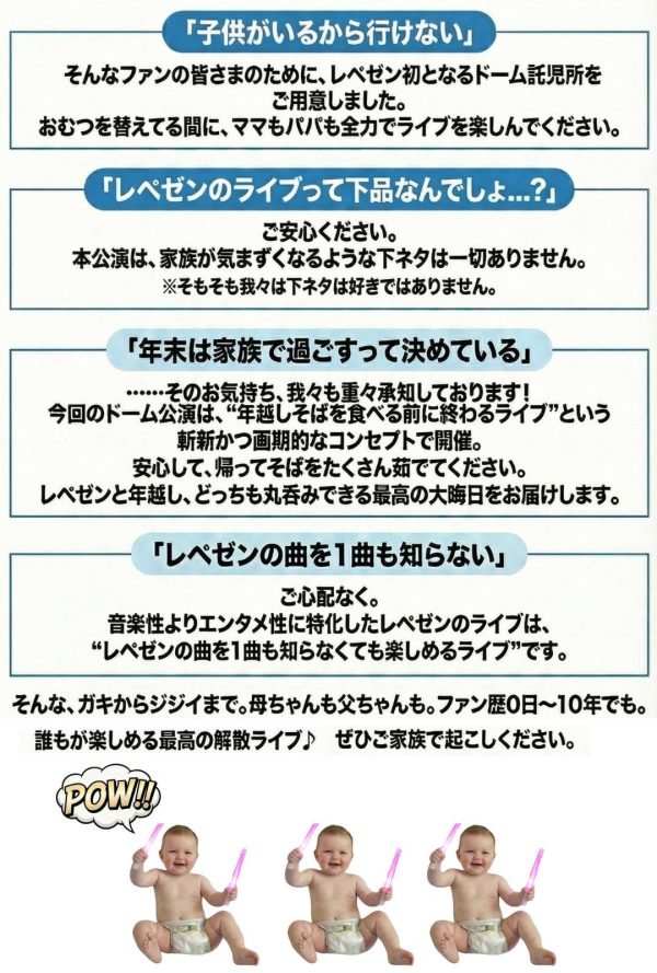 ドーム公演に関して、レペゼンは公式サイト上で「家族で行ける、健全すぎる解散ライブ」をうたい、「家族が気まずくなるような下ネタは一切ありません」と強調。託児所があることもアピールしています。また、19時に終了予定であることから、東京や大阪といった遠隔地でも年越しまでに帰宅できることも紹介しています。