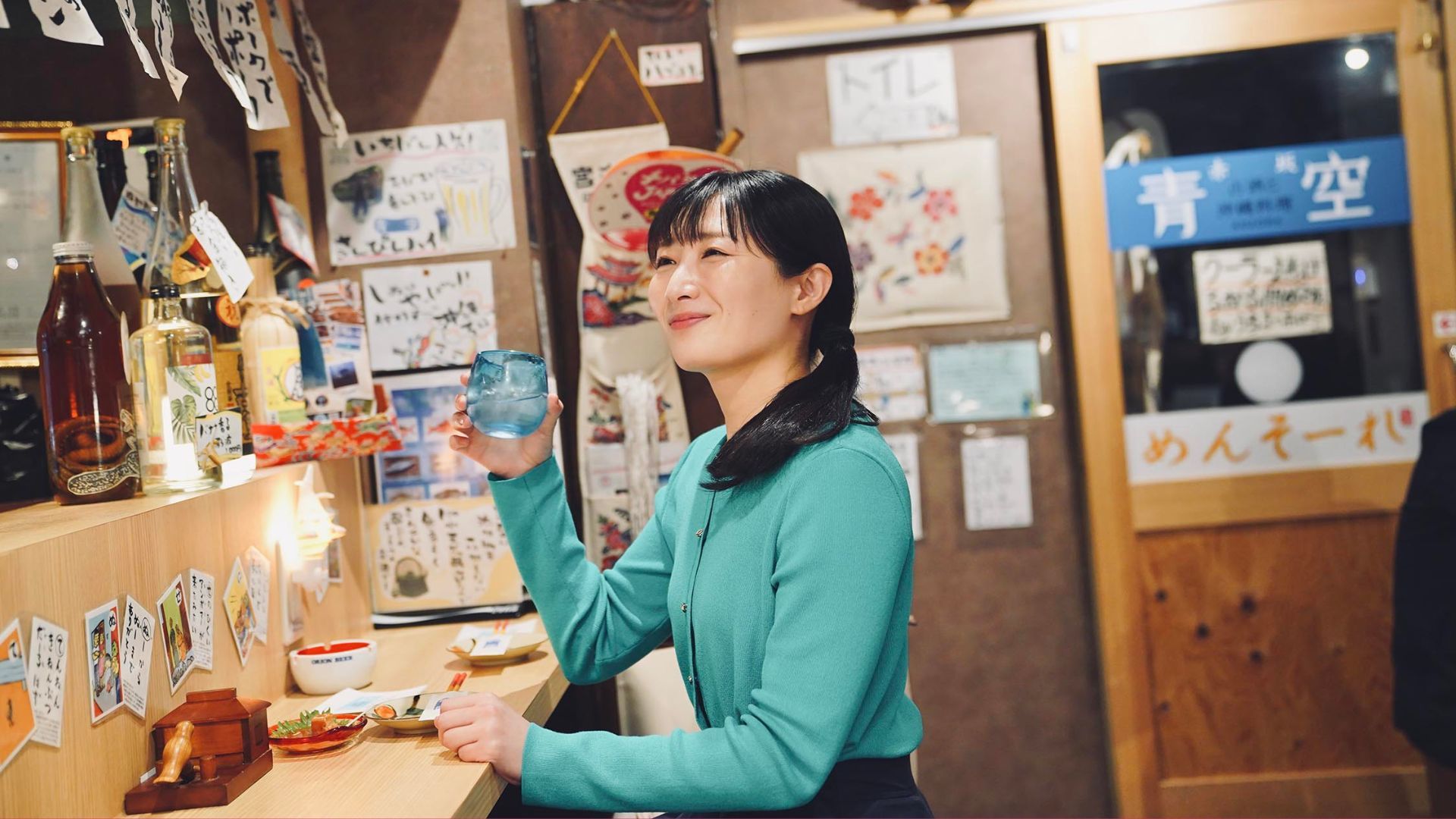 店内へ入ると、三線で演奏しながら沖縄民謡を歌う先客たちの元気であたたかい賑わいがワカコを迎え入れる。カウンター席に着いたワカコは「心は早くも温まった」とホッとした表情を浮かべ、沖縄ならではのお酒で「さらに温まりたい」とカウンター上に並んだ手書きのメニューに視線を送る。