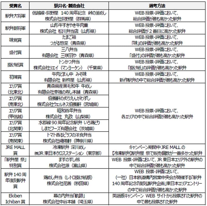 そのほか「味覚賞」は青森県のつがる惣菜「たまご箱」、「盛付賞」は青森県の三咲羽や「三八弁当」、「掛け紙賞」は千葉県のリエイ(マンヨーケン)「トンかつ弁当」など、合計15品の駅弁が受賞しています。