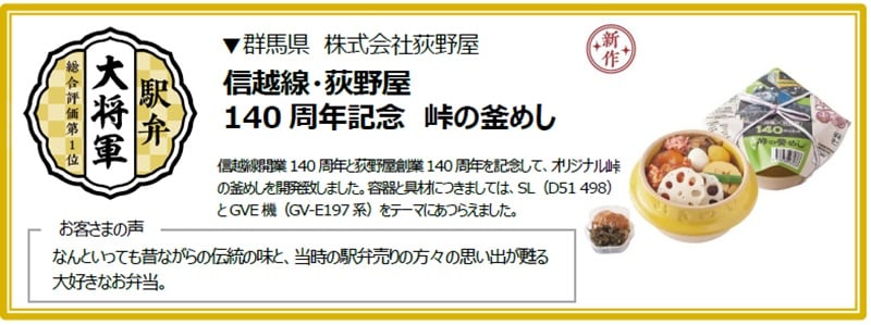 「駅弁大将軍」に輝いたのは、信越線開業140周年と荻野屋創業140周年を記念して開発された駅弁。D51形蒸気機関車498号機(SL)とGV-E197系気動車(GVE機)をテーマとした掛け紙や容器のデザイン、「SLの煙風うずらの卵湯煮」「GV-E197系風栗甘露煮」といった具材が特徴です。