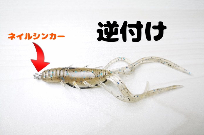 クロー系ワームに逆付けしてお尻にネイルシンカーを入れると、移動距離が短くなります。