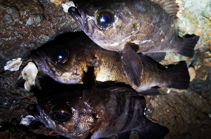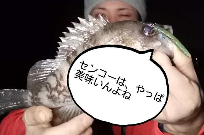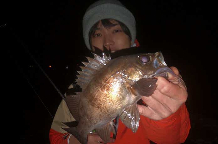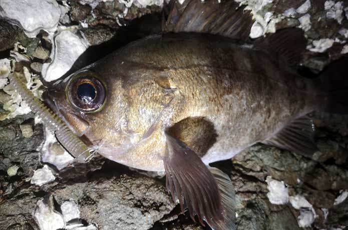 薄暗い牡蠣殻エリアで出たのは、27cmのメバル。