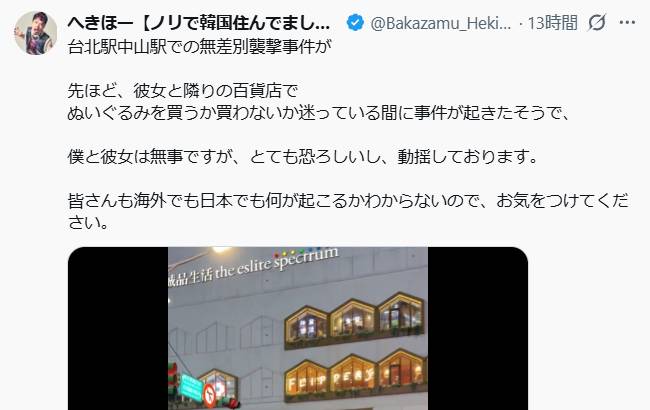 台湾の無差別襲撃事件で3人死亡 元へきトラ・へきほー、「隣の百貨店にいた」と明かす