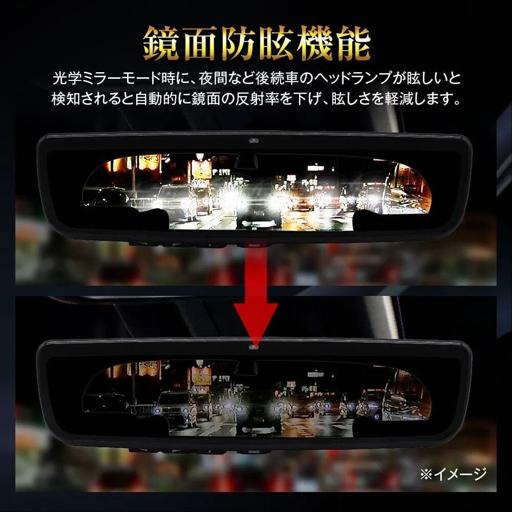 - 鏡面自動防眩機能:光学ミラーモード時、後続車のヘッドランプの眩しさを検知すると、自動的に鏡面の反射率を下げ、眩しさを軽減する。