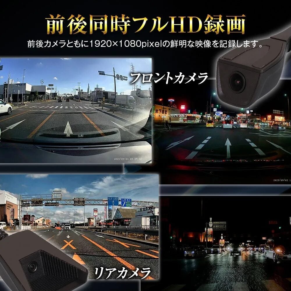 - 前後同時フルHD録画:フロント・リアともに1920×1080pixelのフルHD映像で鮮明に記録。万が一の事故やトラブル時も、前後両方の状況を確実に捉える。
