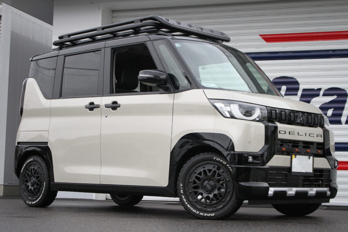 「ルーフラックはオートフラッグス。デリカミニ専用品です。フロントの“DELICA”の立体文字は中を黒くして目立たせています」