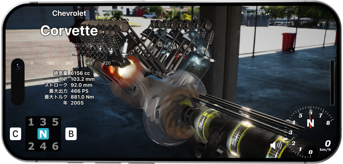 また、エンジン回転数だけでなく、トルクカーブ、車重、ギア比、タイヤ外径などを毎フレーム計算し、車速や加速の伸び方をシミュレートする車両物理モデルも搭載。「エンジンの性格」が駆動系を通じてどう表れるかを体感できます。