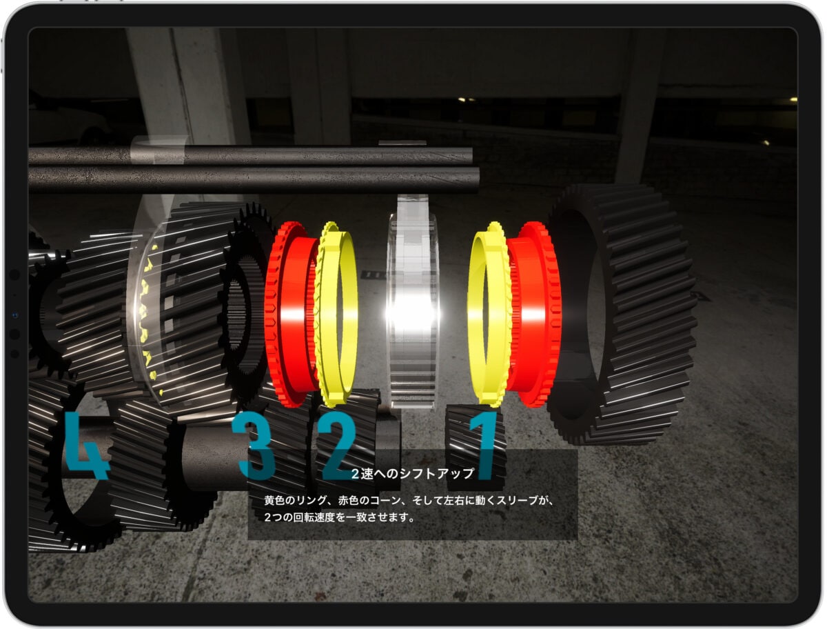 4ストロークサイクル、点火順序、シンクロメッシュ機構など、エンジンと変速機の基本を立体的に学べる「TechTour(テックツアー)」モードを搭載しました。エンジンモデルを実際に動かしながら、「なぜこの順序で動くのか」「なぜこの構造になっているのか」を理解できるよう設計されており、工学や自動車技術に興味を持ち始めた学生や若い世代にもおすすめです。