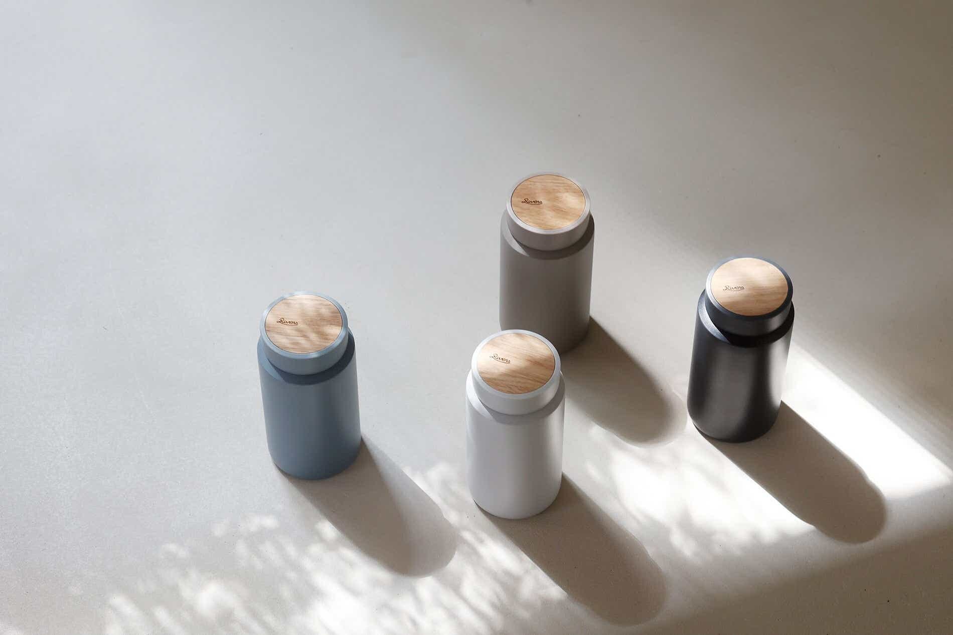 ナチュラルな木目に、くすみカラーがギフト映えする一本が、Riversの「ドリンクボトル モク 350」。