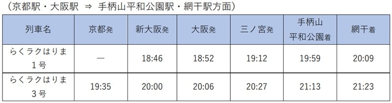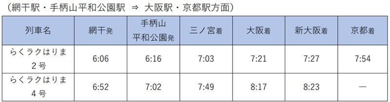 新駅の手柄山平和公園駅には、新快速・快速・普通列車に加え、通勤特急「らくラクはりま」が停車します。指定席特急券を購入すればゆったりと座って移動できる快適・便利な列車です。主要駅の運転時刻は以下の通りです。