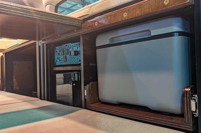 筆者:わかります! 地元のものは地元で、加えて地元の空気の中で飲む一杯、最高ですよね。 キッチンより冷蔵庫。これがリアルなバンライファーの結論なんですね。