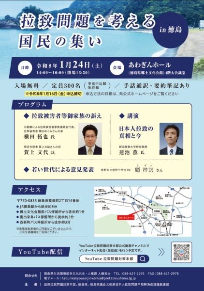 北朝鮮による日本人拉致問題への認識を広く深めてもらう一助にと、2026年1月24日(土)14時~16時に徳島市のあわぎんホール(徳島県郷土文化会館)で、「拉致問題を考える国民の集いin徳島」が開催される。政府拉致問題対策本部、徳島県、徳島県議会北朝鮮日本人拉致問題早期解決促進議員連盟の主催。入場無料。参加者申し込みを受け付けている。