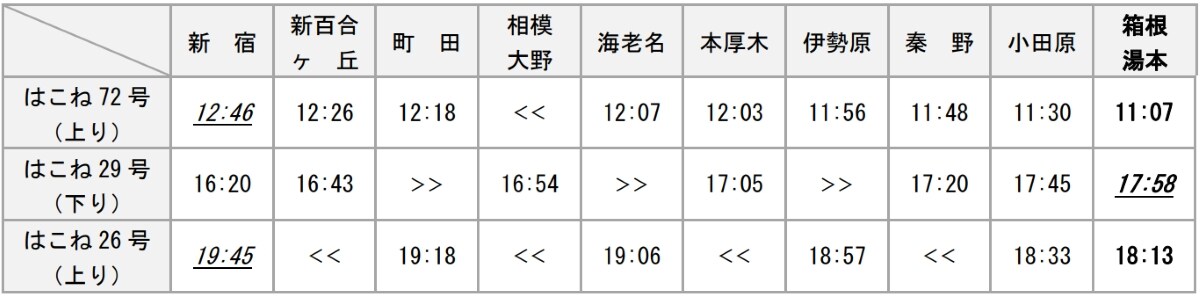 また、現行では小田原駅発着となっている「はこね72号」「はこね29号」「はこね26号」の3列車について、運行区間を箱根湯本駅発着へと拡大し、乗り換えなしで箱根エリアへアクセスできるようにします。