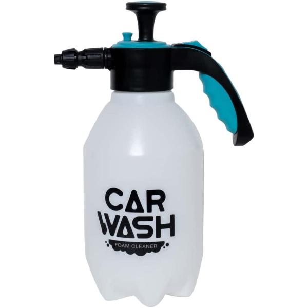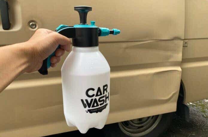 車全体に泡を吹き付け、気になるところはスポンジで擦ったら、ボトル内を水に変えてポンピングして水噴射で洗い流します。