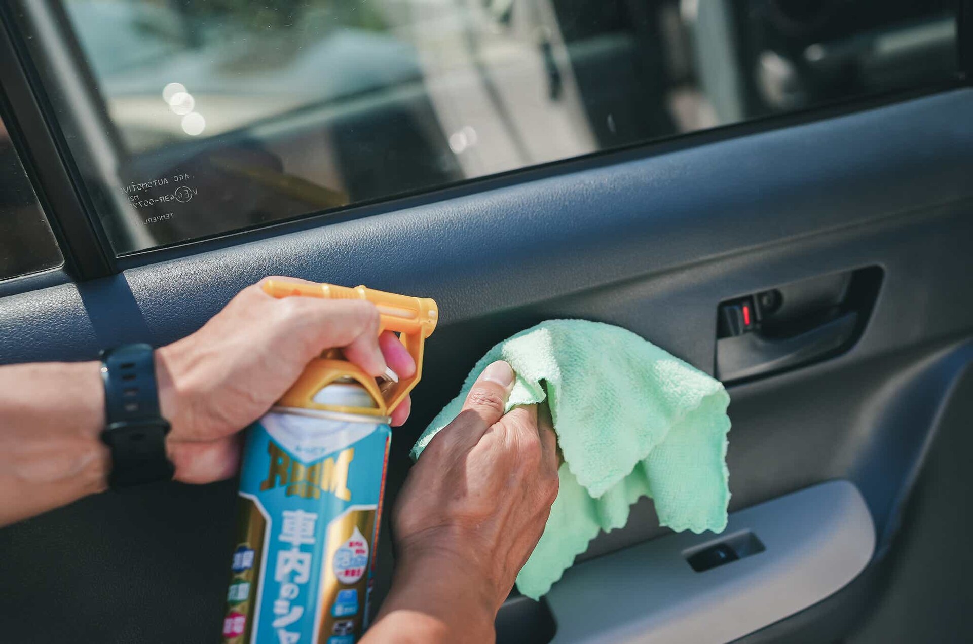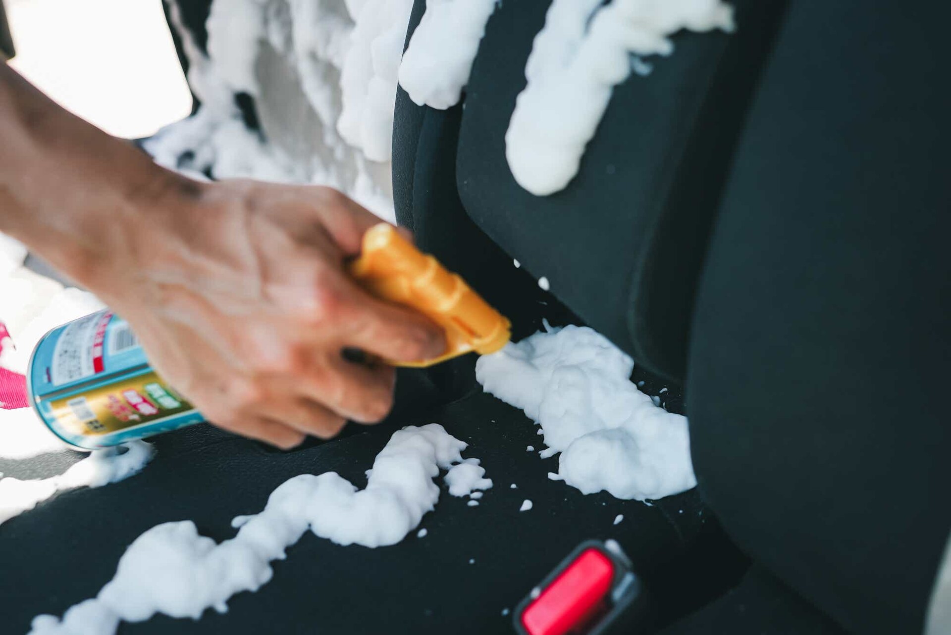 使い方は、本体を振ってからシートの気になる箇所に直接泡を吹きかけ、乾いたタオルで拭くだけ。ベルトやハンドルなどには、タオルにスプレーしてから拭き取ればOK!