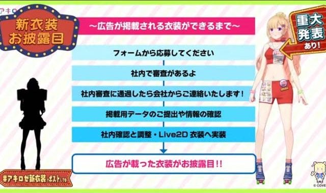 同日、アキは自身のYouTubeチャンネルにて「【新衣装お披露目&重大発表】 #アキロゼ新衣装 4年ぶりにお披露目!【アキロゼ/ホロライブ】」と題したライブ配信を実施。披露された新衣装はセパレートタイプで、上下の衣装それぞれに「広告募集中」と書かれた部分がありました。