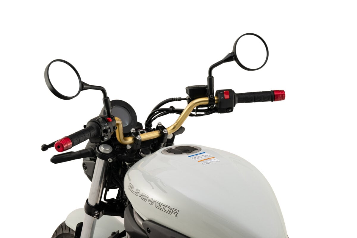 車種専用設計 スイッチ穴加工済で取り付け簡単。ノーマル比 7mmUP/7mmBACK。カラーはゴールド・シルバー・ブラック *別売りでハンドルバーウエイト(写真上)もあります。