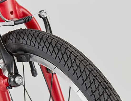 軽量なスポーツタイヤで漕ぎ出しが軽く、道路から受ける衝撃を吸収してくれる1.75インチ幅。空気を入れるバルブは英式なので、普通の自転車の空気入れが使えます。