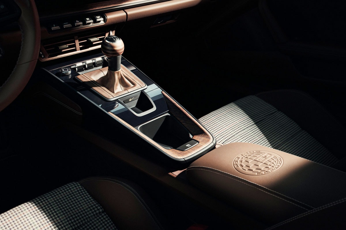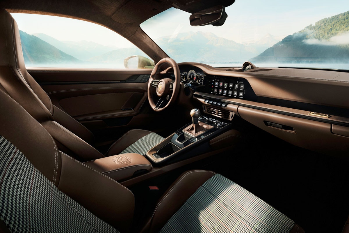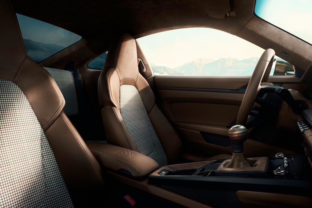 インテリアには、トリュフブラウンのクラブレザーとチョークベージュのステッチを採用。シートセンターには、F. A.ポルシェが愛用していたジャケットの柄を再現した「F. A.グリッド織りファブリック」が用いられている。