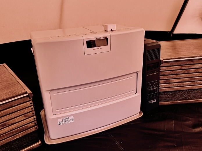 ファンの力でテント内の隅々まで暖気を送り届けてくれる、家庭用の石油ファンヒーターに、ブルーティの薄型ポータブル電源「Handsfree 2」を組み合わせて、キャンプ場で使えるようにしていました。