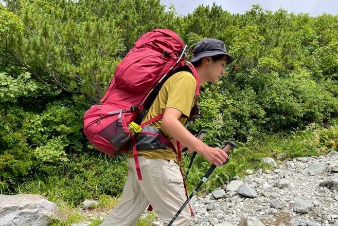 テント泊にも対応する大型モデルで、推奨パッキングウェイトは25kg。重たい荷物を快適に背負えるように、背面パッドの素材にクッション性と通気性に優れる「エアスペーサーメッシュ」が採用されています。立体的なヒップベルトで効率的に荷重を腰回りに分散可能。
