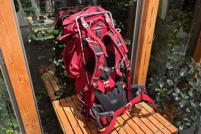 背負子のようなクラシックなアウターフレーム構造が逆に新しい。 「これは置いていくか」と切り詰める考えを捨てて、「とりあえず入れとくか」という考えで荷物が膨らんでしまっても、ちゃんと入るし快適に担げる。