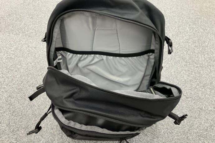 逆台形の形によって荷物を入れたときの重心が自然と上方向に位置する快適設計。開口部はファスナーで大きく開き、前後のグラブハンドルでガバっと広げられます。内側のハイドレーションポケットにノートパソコンを収納可能です。