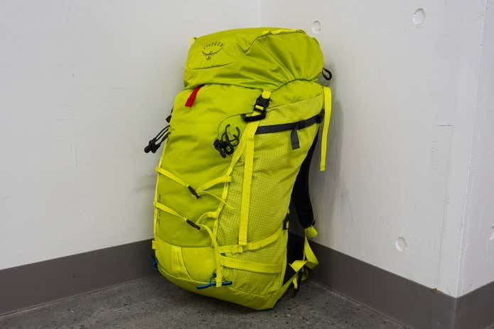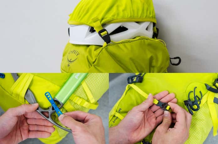 クライミング向けパックの定番モデル。アイスクライミングやアルパインクライミングでの使い勝手を考えて、ヘルメットホルダーを標準で装備し、アックスホルダーも完備。両サイドにスキーキャリーループも備わっています。
