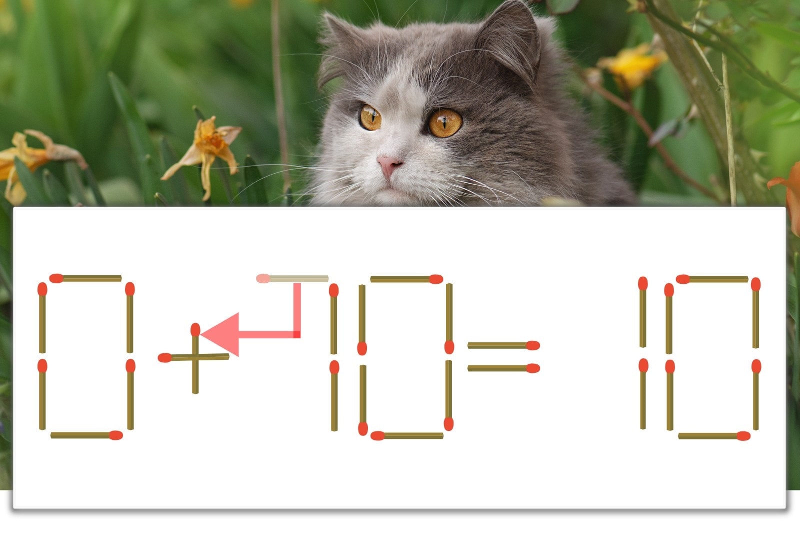 「7」を別の数字に変化させると答えが導き出せます。「7」のマッチ棒を1本移動して、「-」を「+」にしてみましょう。すると、「0+10=10」が成立します。