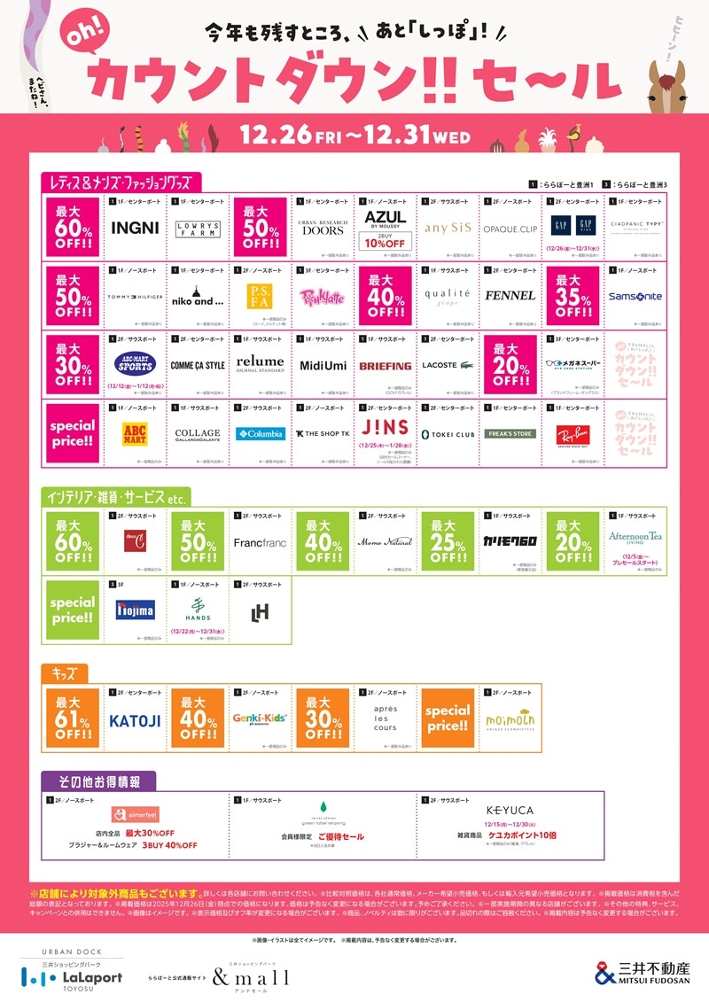 大規模リニューアル目前の「アーバンドック ららぽーと豊洲」ですが、年末年始は12月26日(金)~12月31日(水)まで「カウントダウンセール」を開催。