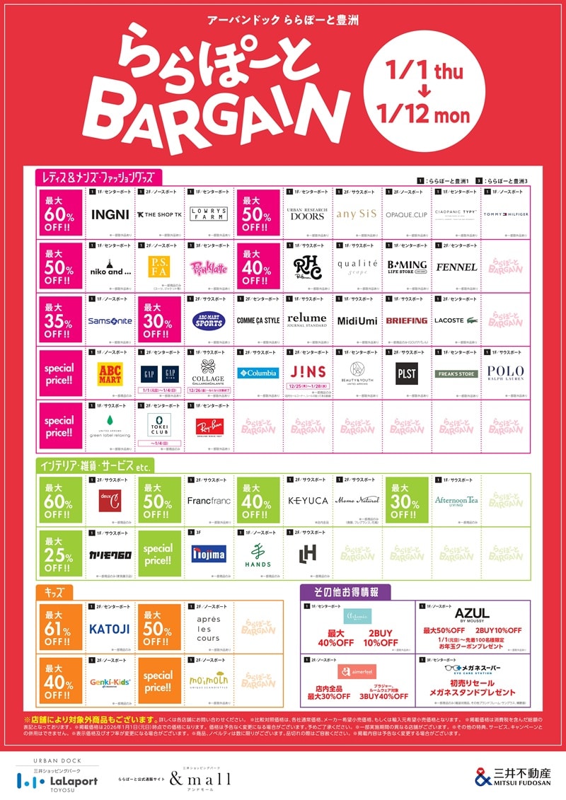 2026年1月1日(木)~1月12日(月・祝)まで、「ららぽーとバーゲン」を開催します。対象となる約51店舗の商品を、最大60%オフの特別価格で購入できます。