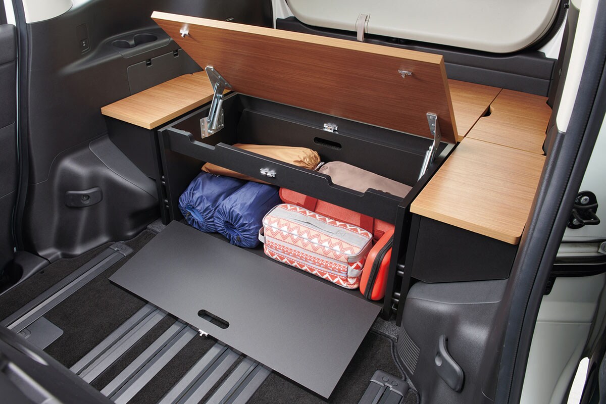 アウトドア・アイテムなどの趣味の道具を整然と積めるだけでなく、災害時の非常持出し用品の保管場所などとしても活用できる。また、ボックス上にも荷物を乗せることができ、荷室を上下の空間で有効活用ができるほか、ボックス上面の天板の一部を持ち上げてテーブルとして使用でき、ボックスをベンチにして食事やデスクワークなどにも活用できる。