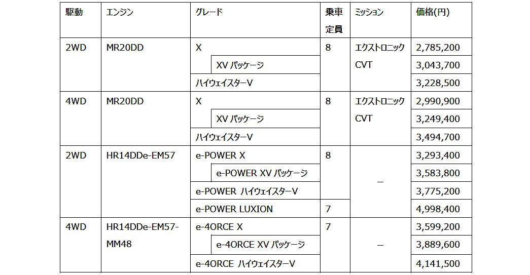 「LUXION」と「ハイウェイスターV」は、フロントグリルとアルミホイールにそれぞれ新たなデザインを採用した。「LUXION」は、より上質さとプレミアム感のある洗練されたエクステリアに仕上げ、インテリアにはしっとりとした触感と包まれる心地よさをもたらす次世代素材「テーラーフィット」のシートを採用している。