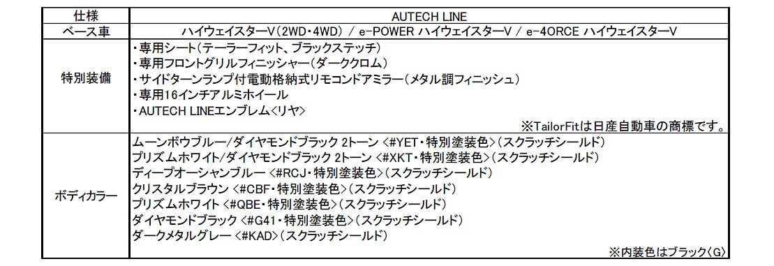 また、「セレナ」のマイナーチェンジにあわせ、カスタムカー「AUTECH」、「AUTECH SPORTS SPEC」や車中泊仕様車「マルチベッド」、「ステップタイプ」、福祉仕様の「ライフケアビークル(LV)」シリーズをマイナーチェンジした。