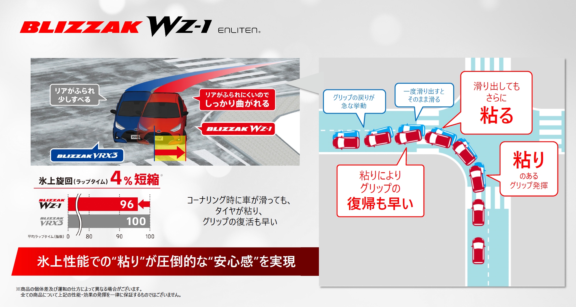 これらの要求に対し、WZ-1は、ブリヂストンのタイヤ設計基盤技術であるENLITEN(エンライトン)を採り入れ、VRX3と比較し、アイスでのブレーキ性能、コーナーで粘って曲がる性能を高め、操安性能のレベルを向上させている。