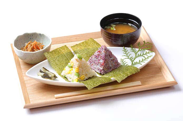 看板メニューは、埼玉県産のお米「彩のきずな」を使用した「天空むすび」。 宝登山の山容をイメージしたピラミッド型のおむすびは、見た目の可愛さだけでなく、具材の組み合わせにもこだわりが詰まっています。