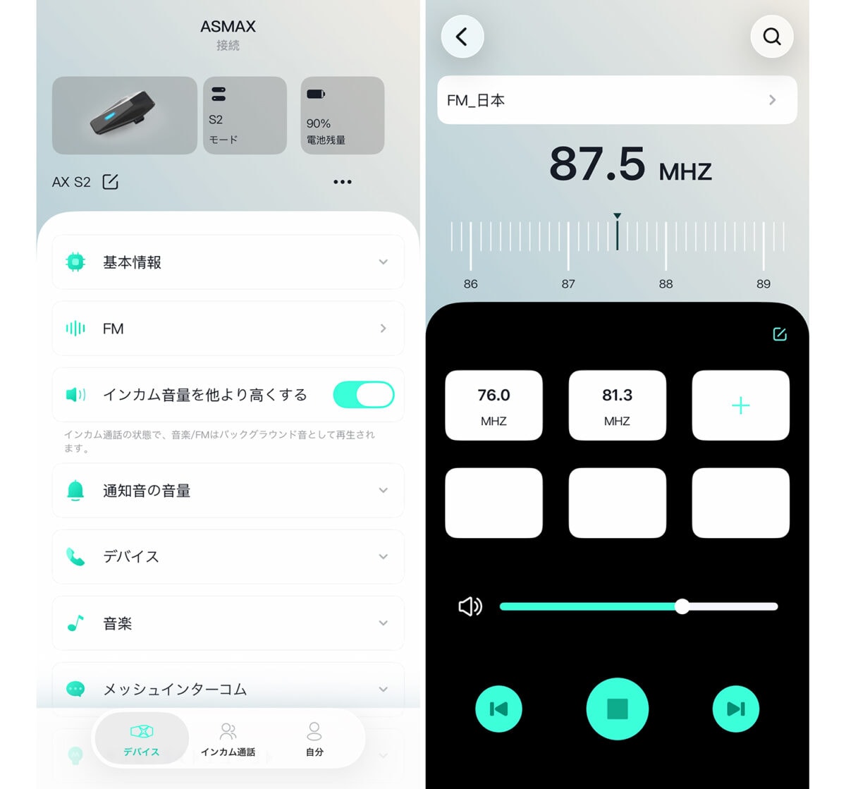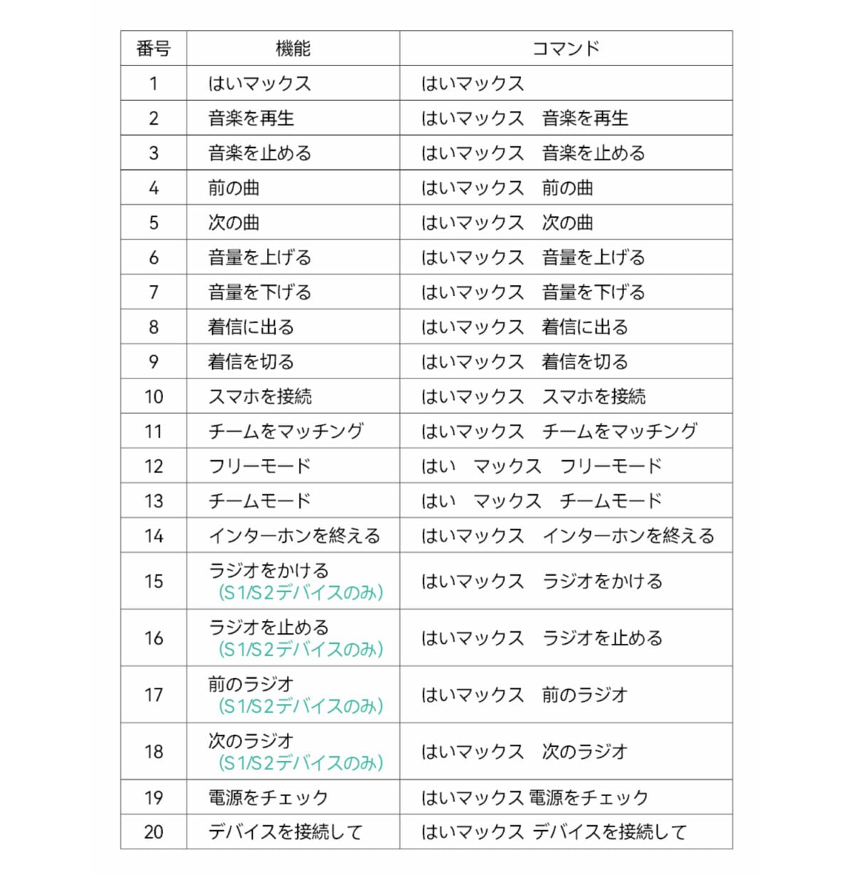 S2では本体のボタン操作だけでなく音声コマンドでの操作に対応しており、ウェイクアップワード(音声認識キーワード)の「ハイ、マックス!」でスマホの音声アシスタントが使えるだけでなく、走行中でも音楽再生・音量調整・チーム作成/通話応答ほかハンズフリーで操作可能だ。